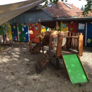 Im Haus stehen den Kindern individuell gestaltete Gruppenräume, ein Hausaufgabenzimmer, Schlaf- und Ruheraum, Schreibstube, Bücherecke, Atelier, Kreativbastelecke sowie eine Kinderküche zur Verfügung. Die große Freifläche, die mit Unterstützung der Eltern und Unternehmen der Stadt zu einem „Garten für Kinder“ umgestaltet wurde, bietet für alle Altersgruppen etwas: Sandkästen, Spielgeräte, Spielhäuser, eine Dusche für warme Sommertage, Gemüsegarten, Matschanlage und ein Tiergehege mit Kaninchen.